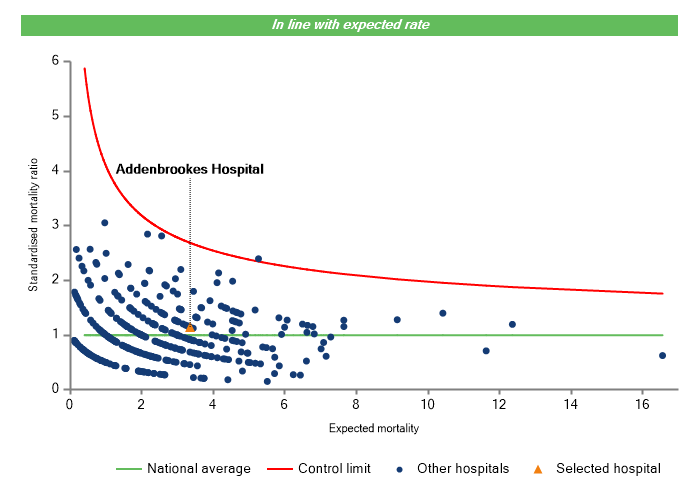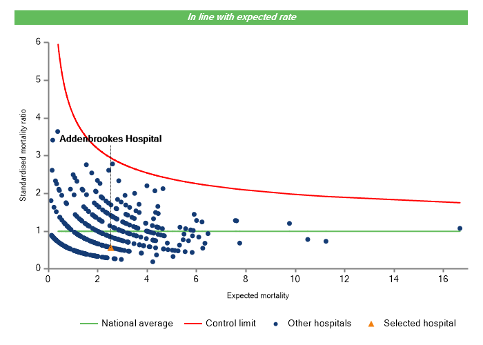 The vertical axis figures are presented as a standardised mortality ratio. This means the values do not represent percentages of patients who have died, but they represent the proportion of deaths compared to the national average. The data is also ‘risk adjusted’ to take account of the fact that different hospitals may operate on more higher-risk or lower-risk patients e.g. because of demographics in the patient population they work with.