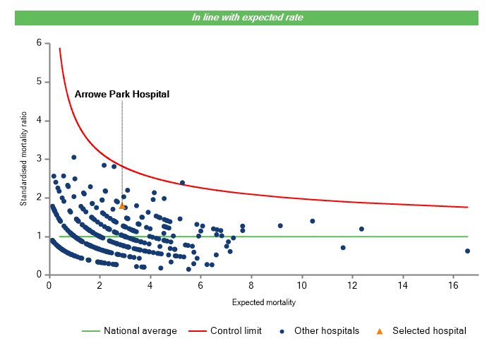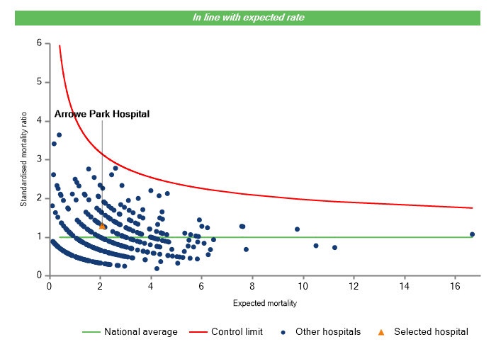The vertical axis figures are presented as a standardised mortality ratio. This means the values do not represent percentages of patients who have died, but they represent the proportion of deaths compared to the national average. The data is also ‘risk adjusted’ to take account of the fact that different hospitals may operate on more higher-risk or lower-risk patients e.g. because of demographics in the patient population they work with.