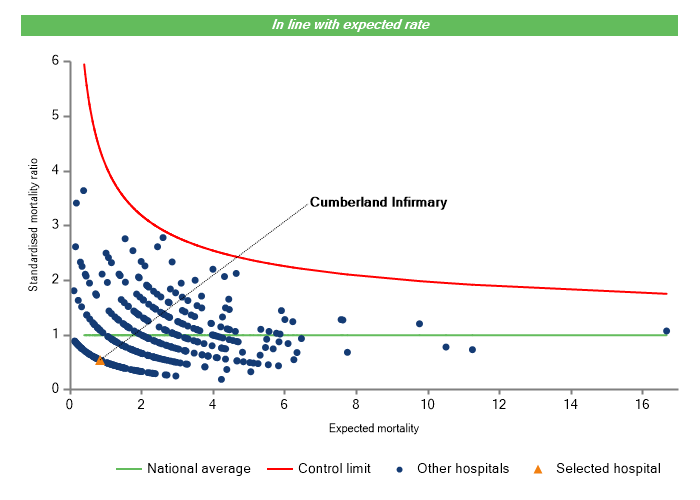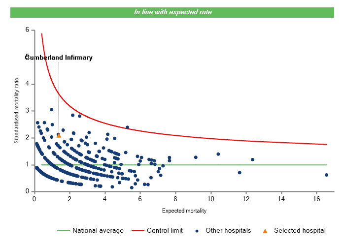 The vertical axis figures are presented as a standardised mortality ratio. This means the values do not represent percentages of patients who have died, but they represent the proportion of deaths compared to the national average. The data is also ‘risk adjusted’ to take account of the fact that different hospitals may operate on more higher-risk or lower-risk patients e.g. because of demographics in the patient population they work with.