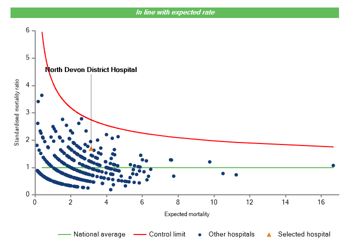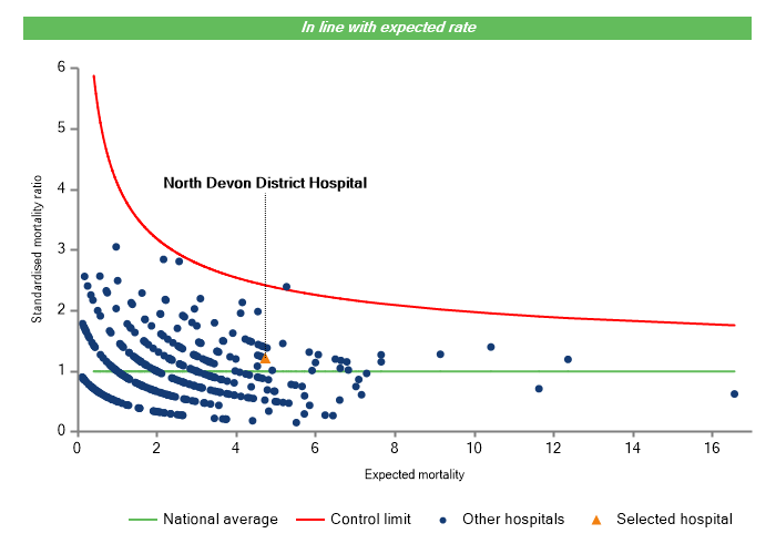 The vertical axis figures are presented as a standardised mortality ratio. This means the values do not represent percentages of patients who have died, but they represent the proportion of deaths compared to the national average. The data is also ‘risk adjusted’ to take account of the fact that different hospitals may operate on more higher-risk or lower-risk patients e.g. because of demographics in the patient population they work with.