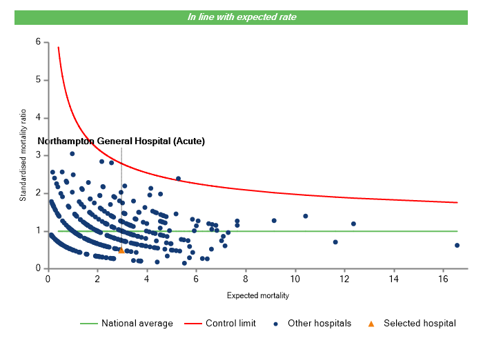 The vertical axis figures are presented as a standardised mortality ratio. This means the values do not represent percentages of patients who have died, but they represent the proportion of deaths compared to the national average. The data is also ‘risk adjusted’ to take account of the fact that different hospitals may operate on more higher-risk or lower-risk patients e.g. because of demographics in the patient population they work with.