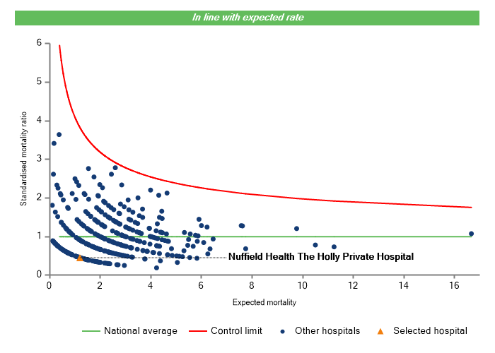 The vertical axis figures are presented as a standardised mortality ratio. This means the values do not represent percentages of patients who have died, but they represent the proportion of deaths compared to the national average. The data is also ‘risk adjusted’ to take account of the fact that different hospitals may operate on more higher-risk or lower-risk patients e.g. because of demographics in the patient population they work with.