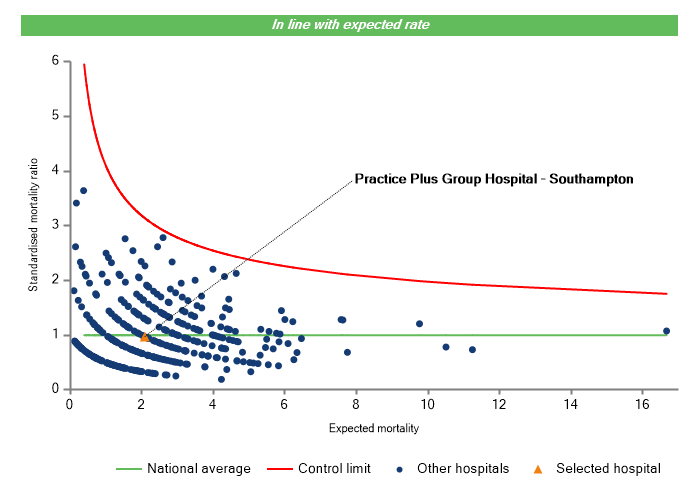 The vertical axis figures are presented as a standardised mortality ratio. This means the values do not represent percentages of patients who have died, but they represent the proportion of deaths compared to the national average. The data is also ‘risk adjusted’ to take account of the fact that different hospitals may operate on more higher-risk or lower-risk patients e.g. because of demographics in the patient population they work with.