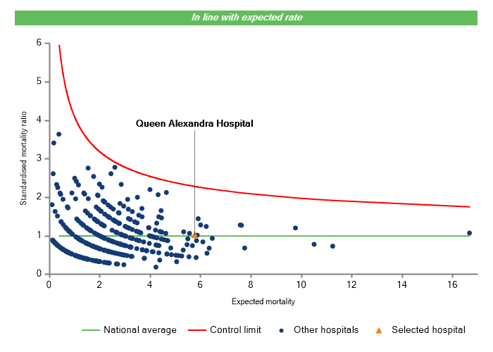 The vertical axis figures are presented as a standardised mortality ratio. This means the values do not represent percentages of patients who have died, but they represent the proportion of deaths compared to the national average. The data is also ‘risk adjusted’ to take account of the fact that different hospitals may operate on more higher-risk or lower-risk patients e.g. because of demographics in the patient population they work with.