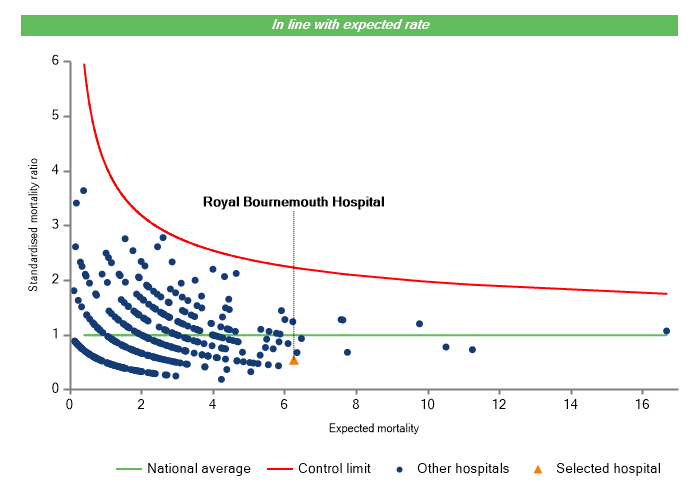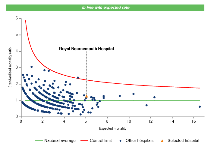 The vertical axis figures are presented as a standardised mortality ratio. This means the values do not represent percentages of patients who have died, but they represent the proportion of deaths compared to the national average. The data is also ‘risk adjusted’ to take account of the fact that different hospitals may operate on more higher-risk or lower-risk patients e.g. because of demographics in the patient population they work with.