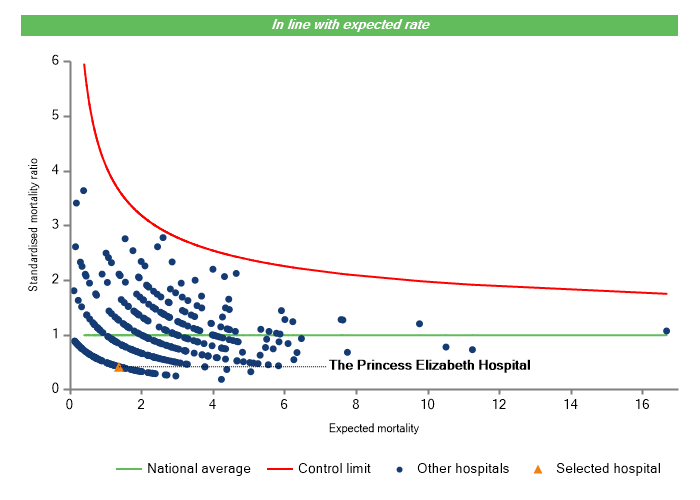 The vertical axis figures are presented as a standardised mortality ratio. This means the values do not represent percentages of patients who have died, but they represent the proportion of deaths compared to the national average. The data is also ‘risk adjusted’ to take account of the fact that different hospitals may operate on more higher-risk or lower-risk patients e.g. because of demographics in the patient population they work with.