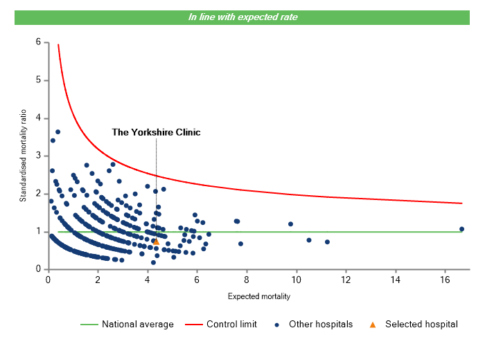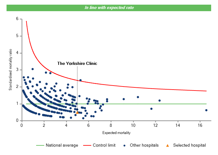 The vertical axis figures are presented as a standardised mortality ratio. This means the values do not represent percentages of patients who have died, but they represent the proportion of deaths compared to the national average. The data is also ‘risk adjusted’ to take account of the fact that different hospitals may operate on more higher-risk or lower-risk patients e.g. because of demographics in the patient population they work with.