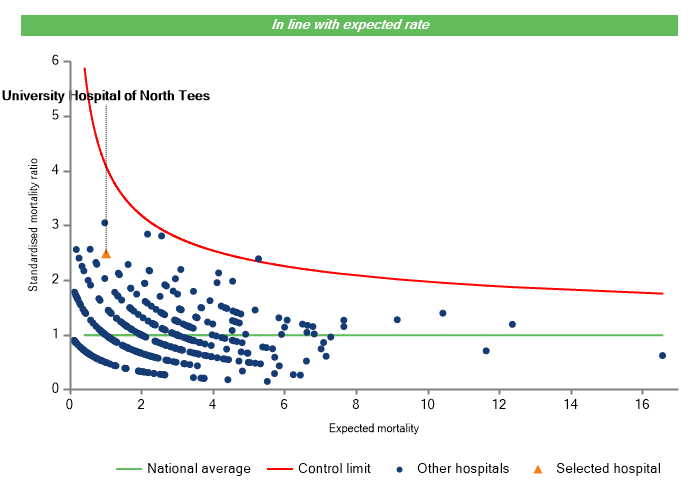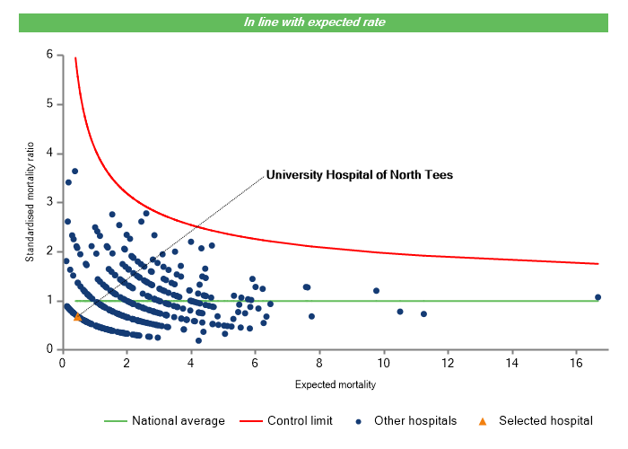 The vertical axis figures are presented as a standardised mortality ratio. This means the values do not represent percentages of patients who have died, but they represent the proportion of deaths compared to the national average. The data is also ‘risk adjusted’ to take account of the fact that different hospitals may operate on more higher-risk or lower-risk patients e.g. because of demographics in the patient population they work with.
