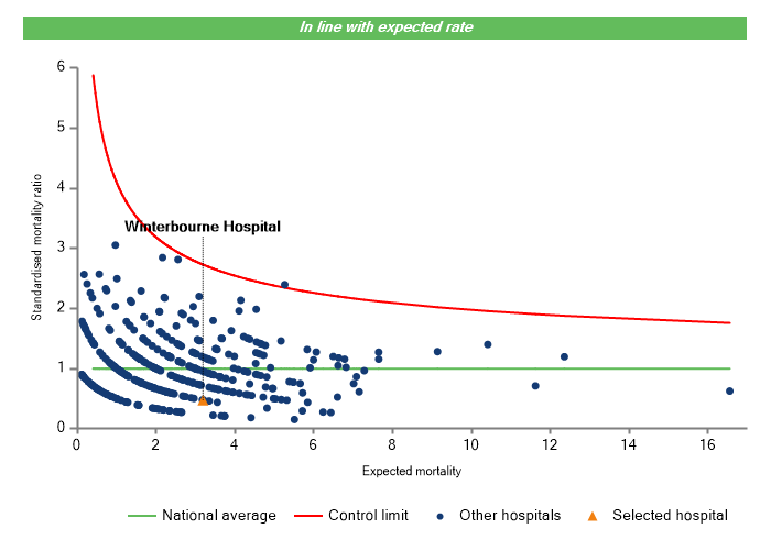The vertical axis figures are presented as a standardised mortality ratio. This means the values do not represent percentages of patients who have died, but they represent the proportion of deaths compared to the national average. The data is also ‘risk adjusted’ to take account of the fact that different hospitals may operate on more higher-risk or lower-risk patients e.g. because of demographics in the patient population they work with.