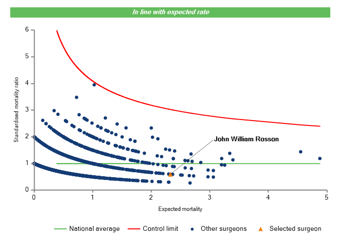 The vertical axis figures are presented as a standardised mortality ratio. This means the values do not represent percentages of patients who have died, but they represent the proportion of deaths compared to the national average. The data is also risk adjusted to take account of the fact that different surgeons may operate on more higher-risk or lower-risk patients e.g. because of demographics in the patient population they work with.