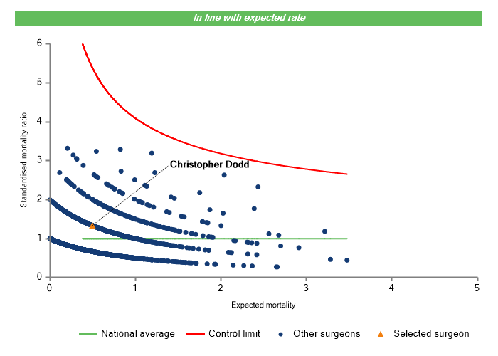 The vertical axis figures are presented as a standardised mortality ratio. This means the values do not represent percentages of patients who have died, but they represent the proportion of deaths compared to the national average. The data is also risk adjusted to take account of the fact that different surgeons may operate on more higher-risk or lower-risk patients e.g. because of demographics in the patient population they work with.