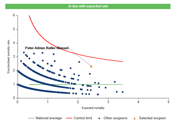 The vertical axis figures are presented as a standardised mortality ratio. This means the values do not represent percentages of patients who have died, but they represent the proportion of deaths compared to the national average. The data is also risk adjusted to take account of the fact that different surgeons may operate on more higher-risk or lower-risk patients e.g. because of demographics in the patient population they work with.