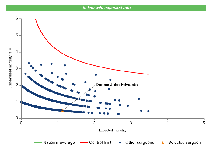 The vertical axis figures are presented as a standardised mortality ratio. This means the values do not represent percentages of patients who have died, but they represent the proportion of deaths compared to the national average. The data is also risk adjusted to take account of the fact that different surgeons may operate on more higher-risk or lower-risk patients e.g. because of demographics in the patient population they work with.