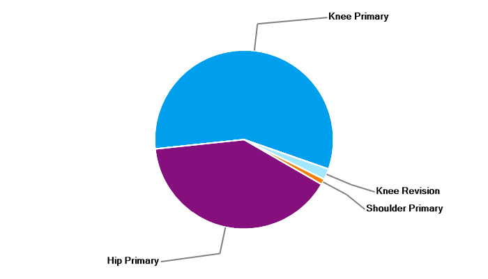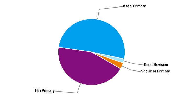 Primary hip replacement Primary total knee replacement Primary unicondylar (partial) knee replacement Primary patello-femoral replacement Revision knee replacement Primary shoulder replacement |