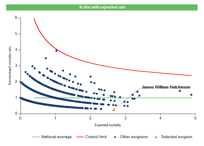 The vertical axis figures are presented as a standardised mortality ratio. This means the values do not represent percentages of patients who have died, but they represent the proportion of deaths compared to the national average. The data is also risk adjusted to take account of the fact that different surgeons may operate on more higher-risk or lower-risk patients e.g. because of demographics in the patient population they work with.