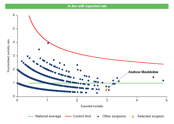 The vertical axis figures are presented as a standardised mortality ratio. This means the values do not represent percentages of patients who have died, but they represent the proportion of deaths compared to the national average. The data is also risk adjusted to take account of the fact that different surgeons may operate on more higher-risk or lower-risk patients e.g. because of demographics in the patient population they work with.