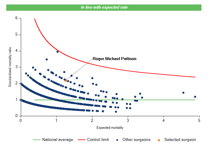 The vertical axis figures are presented as a standardised mortality ratio. This means the values do not represent percentages of patients who have died, but they represent the proportion of deaths compared to the national average. The data is also risk adjusted to take account of the fact that different surgeons may operate on more higher-risk or lower-risk patients e.g. because of demographics in the patient population they work with.