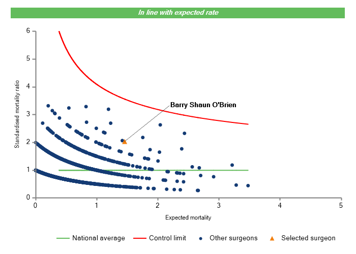 The vertical axis figures are presented as a standardised mortality ratio. This means the values do not represent percentages of patients who have died, but they represent the proportion of deaths compared to the national average. The data is also risk adjusted to take account of the fact that different surgeons may operate on more higher-risk or lower-risk patients e.g. because of demographics in the patient population they work with.