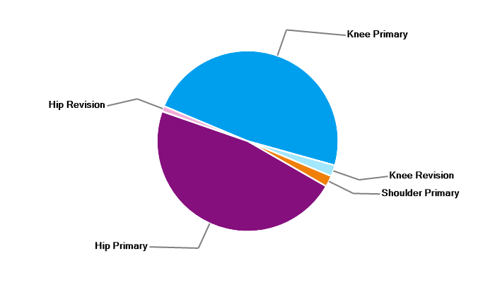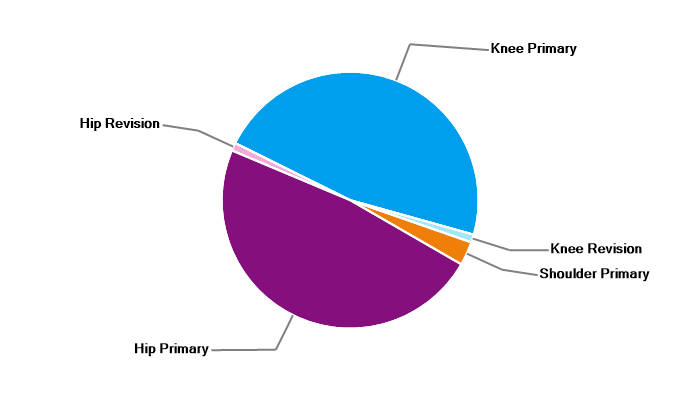 Primary hip replacement Revision hip replacement Primary total knee replacement Primary unicondylar (partial) knee replacement Primary patello-femoral replacement Revision knee replacement |