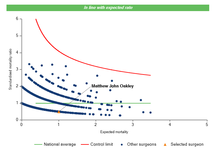 The vertical axis figures are presented as a standardised mortality ratio. This means the values do not represent percentages of patients who have died, but they represent the proportion of deaths compared to the national average. The data is also risk adjusted to take account of the fact that different surgeons may operate on more higher-risk or lower-risk patients e.g. because of demographics in the patient population they work with.