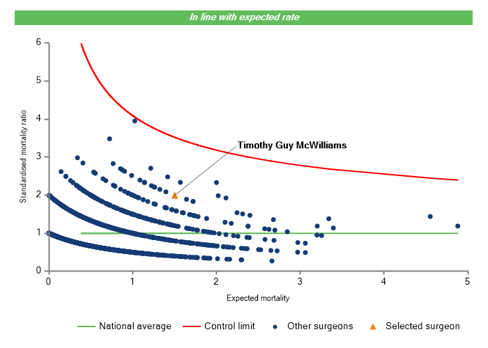 The vertical axis figures are presented as a standardised mortality ratio. This means the values do not represent percentages of patients who have died, but they represent the proportion of deaths compared to the national average. The data is also risk adjusted to take account of the fact that different surgeons may operate on more higher-risk or lower-risk patients e.g. because of demographics in the patient population they work with.