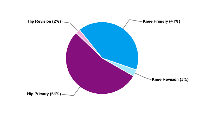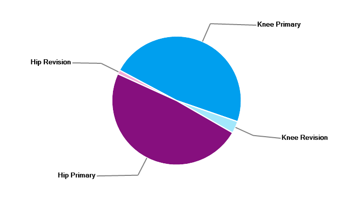 Primary hip replacement Revision hip replacement Hip resurfacing Primary total knee replacement Primary unicondylar (partial) knee replacement Primary patello-femoral replacement Revision knee replacement |