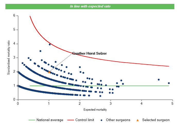 The vertical axis figures are presented as a standardised mortality ratio. This means the values do not represent percentages of patients who have died, but they represent the proportion of deaths compared to the national average. The data is also risk adjusted to take account of the fact that different surgeons may operate on more higher-risk or lower-risk patients e.g. because of demographics in the patient population they work with.