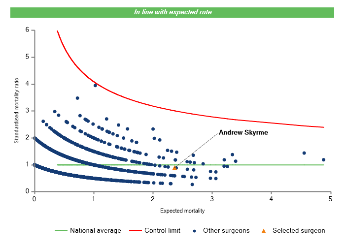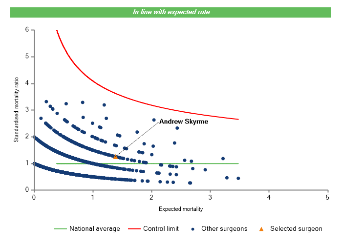 The vertical axis figures are presented as a standardised mortality ratio. This means the values do not represent percentages of patients who have died, but they represent the proportion of deaths compared to the national average. The data is also risk adjusted to take account of the fact that different surgeons may operate on more higher-risk or lower-risk patients e.g. because of demographics in the patient population they work with.