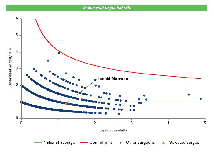 The vertical axis figures are presented as a standardised mortality ratio. This means the values do not represent percentages of patients who have died, but they represent the proportion of deaths compared to the national average. The data is also risk adjusted to take account of the fact that different surgeons may operate on more higher-risk or lower-risk patients e.g. because of demographics in the patient population they work with.
