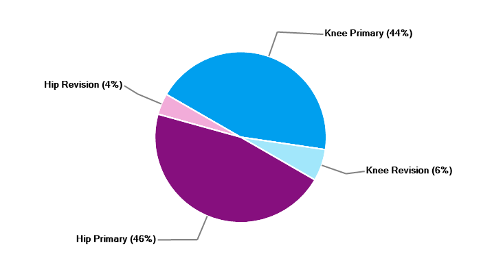 Primary hip replacement Revision hip replacement Primary total knee replacement Primary unicondylar (partial) knee replacement Primary patello-femoral replacement Revision knee replacement |
