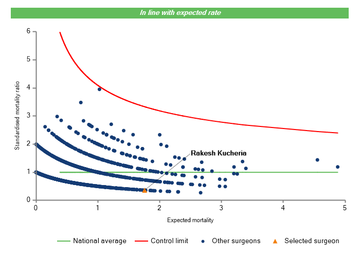The vertical axis figures are presented as a standardised mortality ratio. This means the values do not represent percentages of patients who have died, but they represent the proportion of deaths compared to the national average. The data is also risk adjusted to take account of the fact that different surgeons may operate on more higher-risk or lower-risk patients e.g. because of demographics in the patient population they work with.