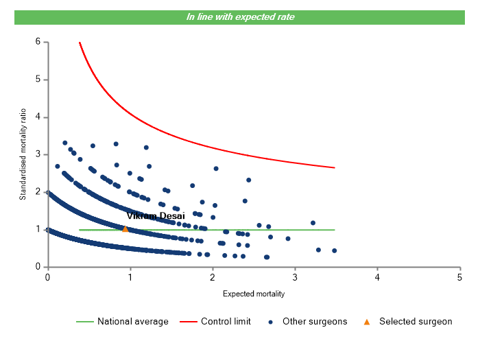 The vertical axis figures are presented as a standardised mortality ratio. This means the values do not represent percentages of patients who have died, but they represent the proportion of deaths compared to the national average. The data is also risk adjusted to take account of the fact that different surgeons may operate on more higher-risk or lower-risk patients e.g. because of demographics in the patient population they work with.