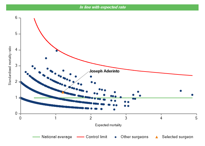 The vertical axis figures are presented as a standardised mortality ratio. This means the values do not represent percentages of patients who have died, but they represent the proportion of deaths compared to the national average. The data is also risk adjusted to take account of the fact that different surgeons may operate on more higher-risk or lower-risk patients e.g. because of demographics in the patient population they work with.