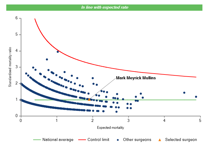 The vertical axis figures are presented as a standardised mortality ratio. This means the values do not represent percentages of patients who have died, but they represent the proportion of deaths compared to the national average. The data is also risk adjusted to take account of the fact that different surgeons may operate on more higher-risk or lower-risk patients e.g. because of demographics in the patient population they work with.