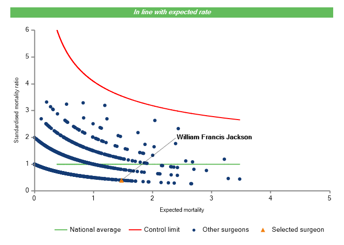 The vertical axis figures are presented as a standardised mortality ratio. This means the values do not represent percentages of patients who have died, but they represent the proportion of deaths compared to the national average. The data is also risk adjusted to take account of the fact that different surgeons may operate on more higher-risk or lower-risk patients e.g. because of demographics in the patient population they work with.
