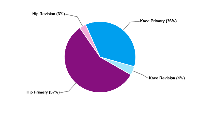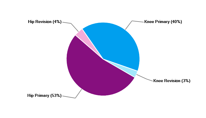 Primary hip replacement Revision hip replacement Primary total knee replacement Primary unicondylar (partial) knee replacement Revision knee replacement |