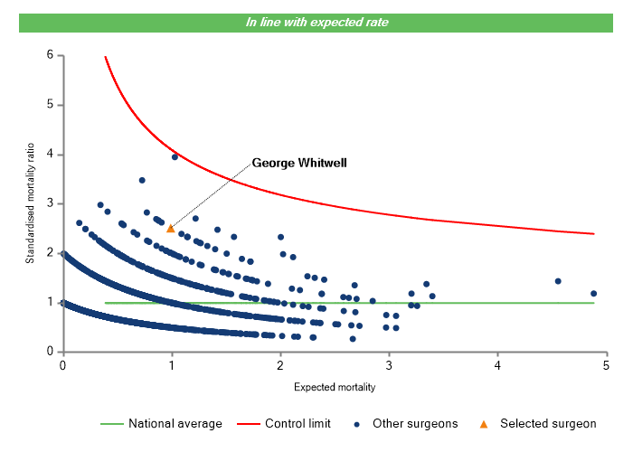 The vertical axis figures are presented as a standardised mortality ratio. This means the values do not represent percentages of patients who have died, but they represent the proportion of deaths compared to the national average. The data is also risk adjusted to take account of the fact that different surgeons may operate on more higher-risk or lower-risk patients e.g. because of demographics in the patient population they work with.