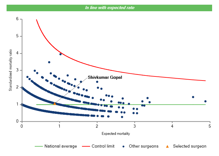 The vertical axis figures are presented as a standardised mortality ratio. This means the values do not represent percentages of patients who have died, but they represent the proportion of deaths compared to the national average. The data is also risk adjusted to take account of the fact that different surgeons may operate on more higher-risk or lower-risk patients e.g. because of demographics in the patient population they work with.