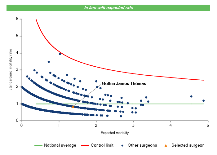 The vertical axis figures are presented as a standardised mortality ratio. This means the values do not represent percentages of patients who have died, but they represent the proportion of deaths compared to the national average. The data is also risk adjusted to take account of the fact that different surgeons may operate on more higher-risk or lower-risk patients e.g. because of demographics in the patient population they work with.