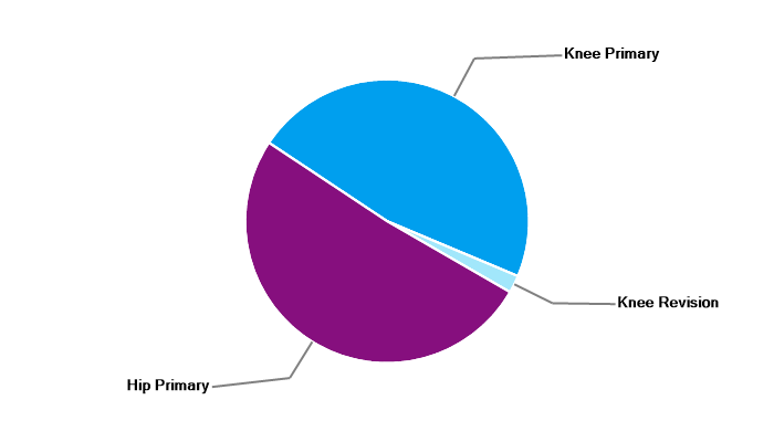 Primary hip replacement Revision hip replacement Primary total knee replacement Primary unicondylar (partial) knee replacement Primary patello-femoral replacement Revision knee replacement |