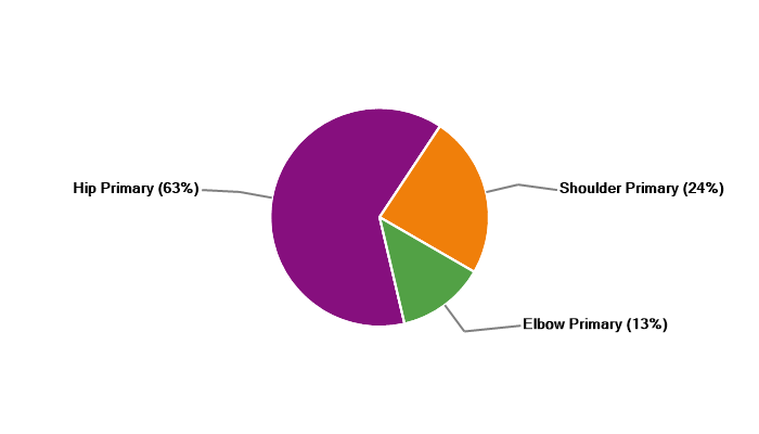 This information display shows overall characteristics for first-time elbow replacement patients treated by this surgeon between 1 April 2012 and 31 March 2025. Against each characteristic you will be able to see whether this surgeon has been responsible for a greater or fewer number of patients of a particular type. This surgeon is represented on the chart by the black marker (