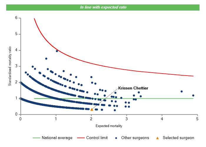 The vertical axis figures are presented as a standardised mortality ratio. This means the values do not represent percentages of patients who have died, but they represent the proportion of deaths compared to the national average. The data is also risk adjusted to take account of the fact that different surgeons may operate on more higher-risk or lower-risk patients e.g. because of demographics in the patient population they work with.