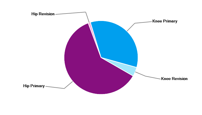 Primary hip replacement Revision hip replacement Primary total knee replacement Primary unicondylar (partial) knee replacement Primary patello-femoral replacement Revision knee replacement |