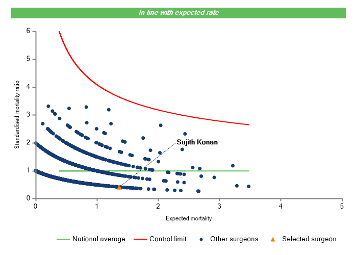 The vertical axis figures are presented as a standardised mortality ratio. This means the values do not represent percentages of patients who have died, but they represent the proportion of deaths compared to the national average. The data is also risk adjusted to take account of the fact that different surgeons may operate on more higher-risk or lower-risk patients e.g. because of demographics in the patient population they work with.