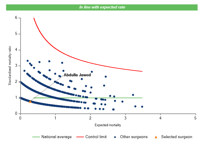 The vertical axis figures are presented as a standardised mortality ratio. This means the values do not represent percentages of patients who have died, but they represent the proportion of deaths compared to the national average. The data is also risk adjusted to take account of the fact that different surgeons may operate on more higher-risk or lower-risk patients e.g. because of demographics in the patient population they work with.