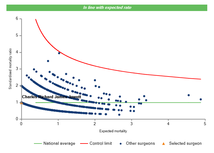 The vertical axis figures are presented as a standardised mortality ratio. This means the values do not represent percentages of patients who have died, but they represent the proportion of deaths compared to the national average. The data is also risk adjusted to take account of the fact that different surgeons may operate on more higher-risk or lower-risk patients e.g. because of demographics in the patient population they work with.
