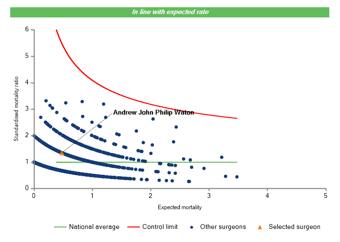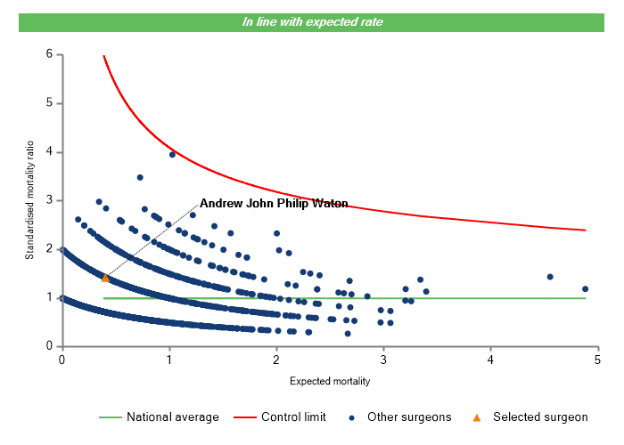 The vertical axis figures are presented as a standardised mortality ratio. This means the values do not represent percentages of patients who have died, but they represent the proportion of deaths compared to the national average. The data is also risk adjusted to take account of the fact that different surgeons may operate on more higher-risk or lower-risk patients e.g. because of demographics in the patient population they work with.