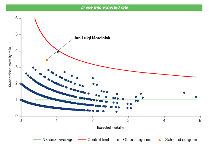The vertical axis figures are presented as a standardised mortality ratio. This means the values do not represent percentages of patients who have died, but they represent the proportion of deaths compared to the national average. The data is also risk adjusted to take account of the fact that different surgeons may operate on more higher-risk or lower-risk patients e.g. because of demographics in the patient population they work with.