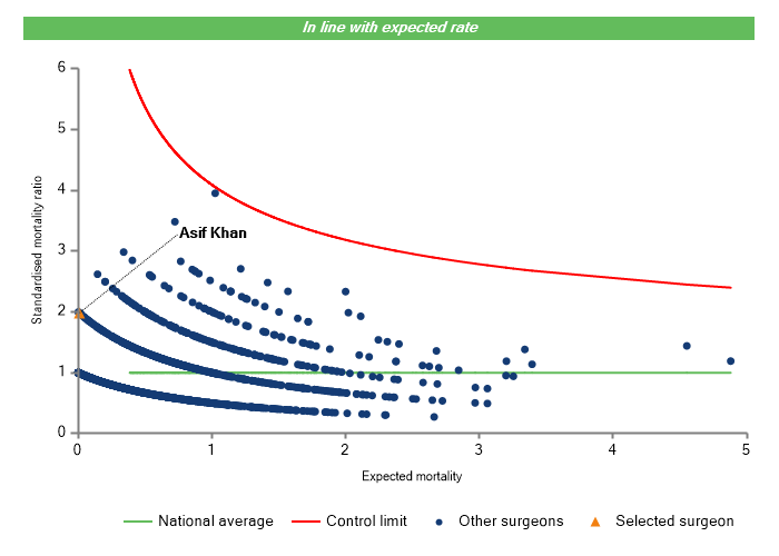 The vertical axis figures are presented as a standardised mortality ratio. This means the values do not represent percentages of patients who have died, but they represent the proportion of deaths compared to the national average. The data is also risk adjusted to take account of the fact that different surgeons may operate on more higher-risk or lower-risk patients e.g. because of demographics in the patient population they work with.