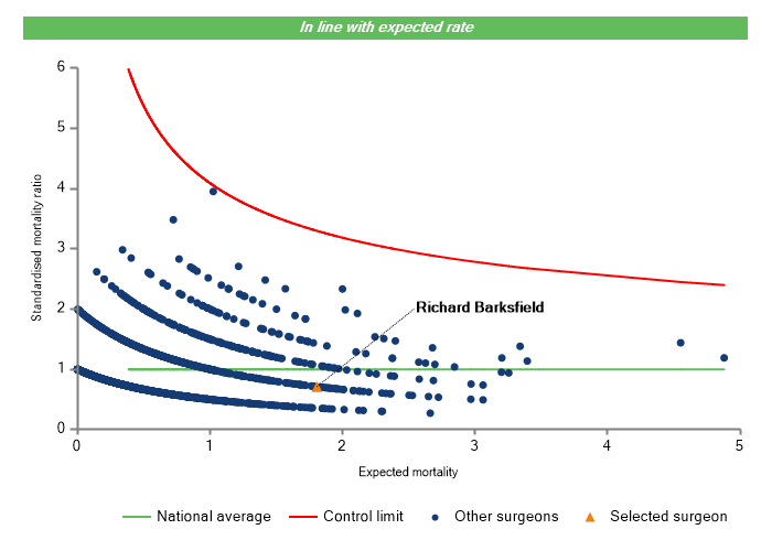 The vertical axis figures are presented as a standardised mortality ratio. This means the values do not represent percentages of patients who have died, but they represent the proportion of deaths compared to the national average. The data is also risk adjusted to take account of the fact that different surgeons may operate on more higher-risk or lower-risk patients e.g. because of demographics in the patient population they work with.